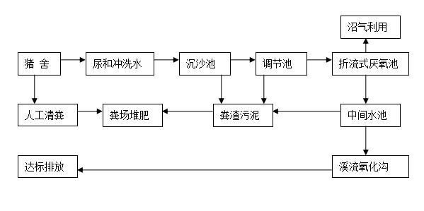 分離后的污水自流進入沉沙池、調(diào)節(jié)池,污水經(jīng)沉淀、酸化及均衡調(diào)節(jié)后,清除部分水解污泥至污泥干化池。污水經(jīng)泵提升后進入折流式厭氧反應(yīng)池(ABR),進行第一級生化處理,產(chǎn)生沼氣用于發(fā)電、食堂飲事、供熱等。沉淀污泥經(jīng)污泥干化池干化后,送堆肥場和人工清除的糞便一起堆積發(fā)酵,作復(fù)合肥利用。