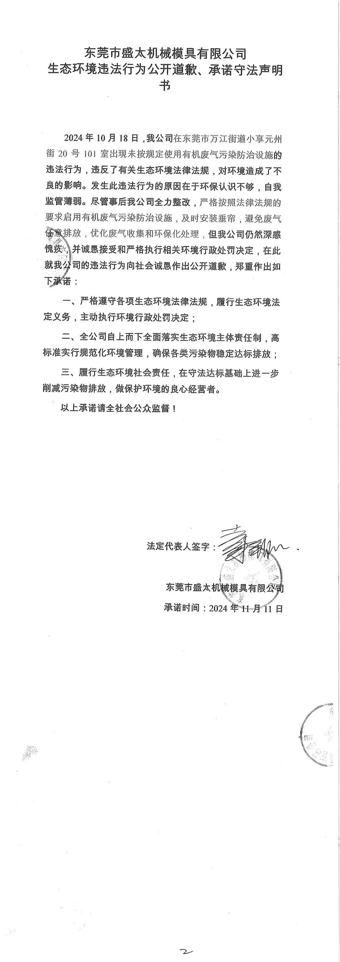 東莞市盛太機械模具有限公司生態(tài)環(huán)境違法行為公開道歉、承諾守法聲明書