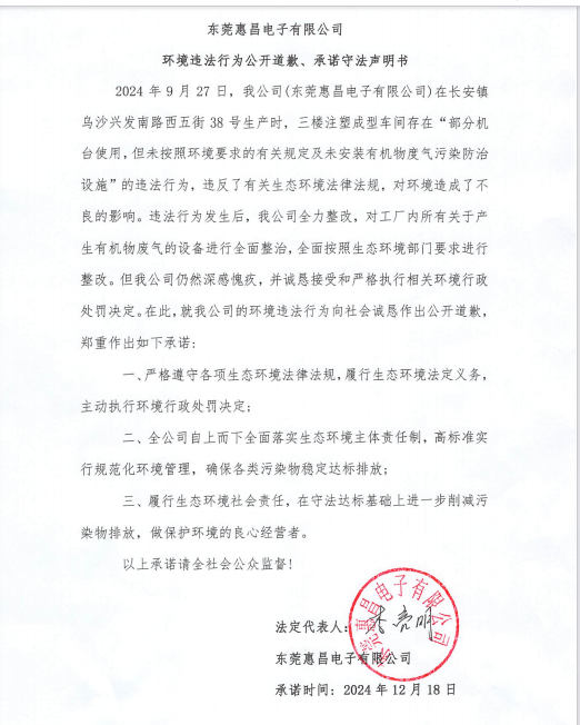 東莞惠昌電子有限公司生態(tài)環(huán)境違法行為公開道歉、承諾守法聲明書