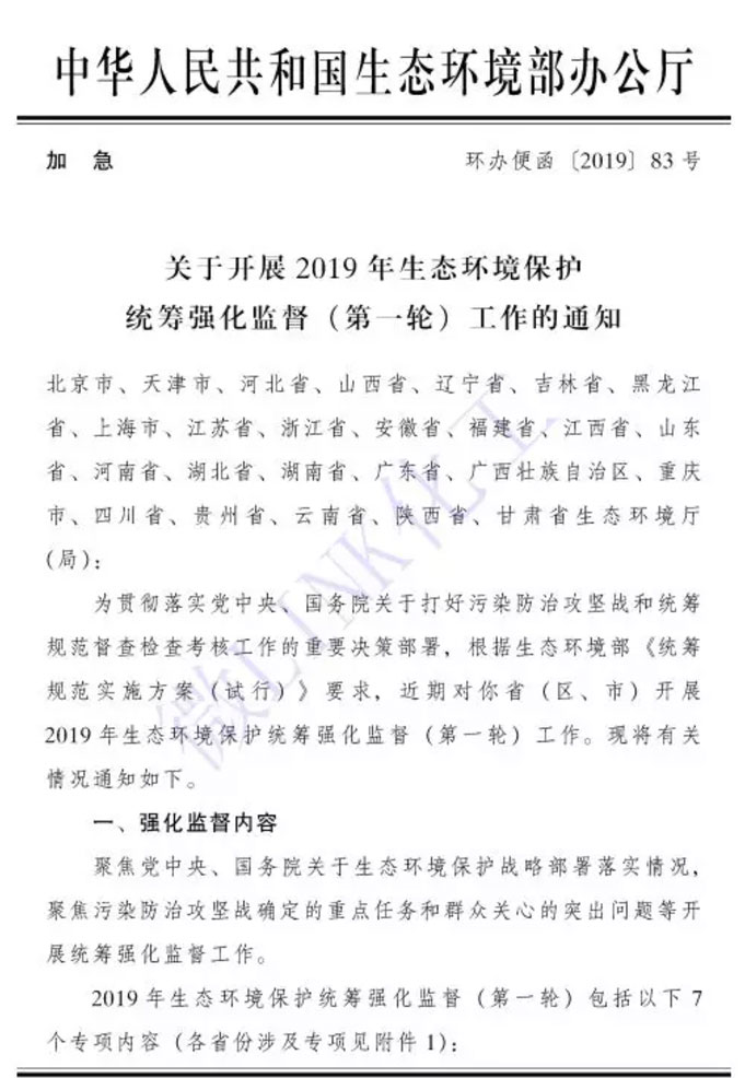 2019年生態環境保護統籌強化監督(第一輪)包括以下7個專項內容: