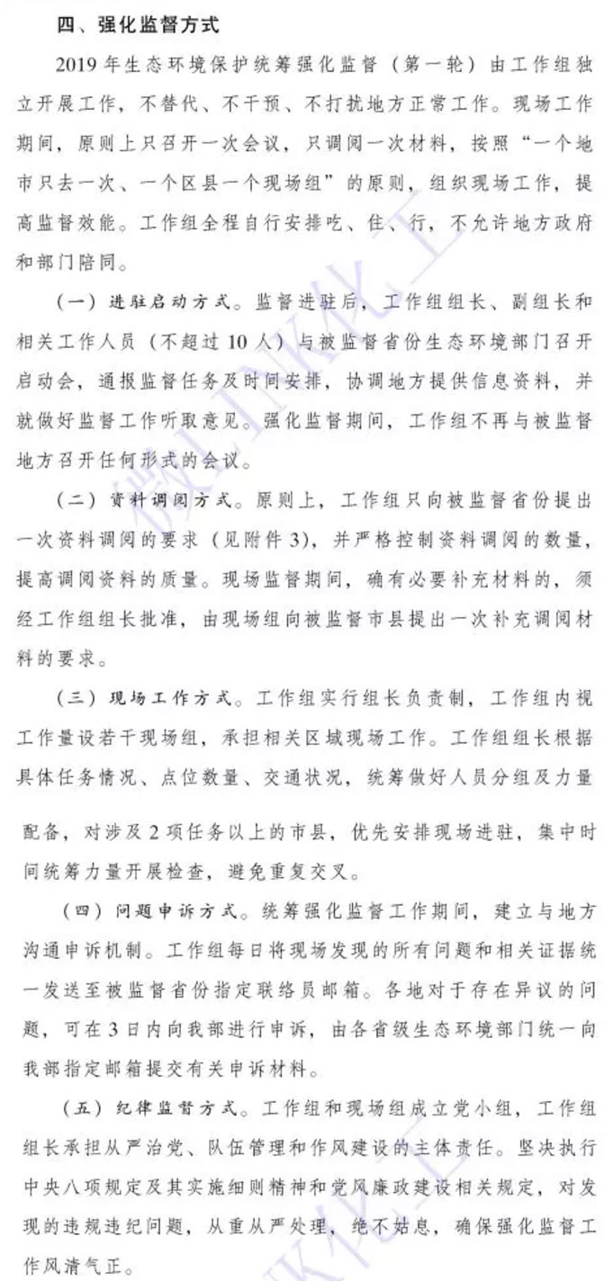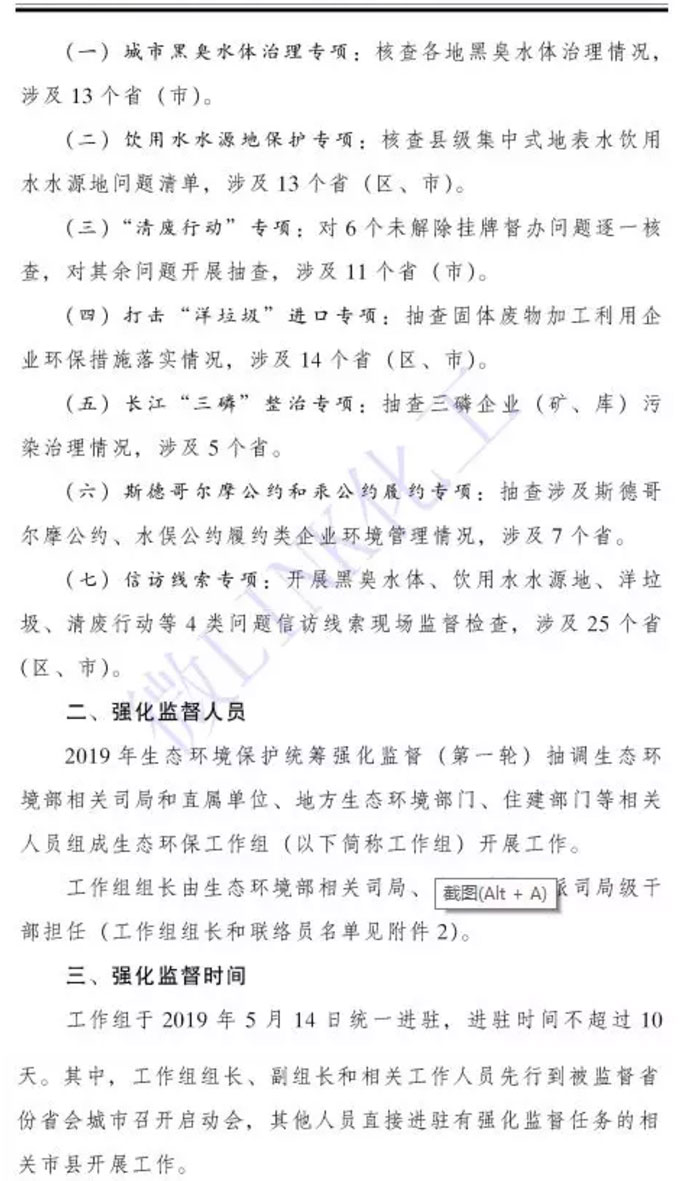 近期,生態環境部根據《統籌規范實施方案(試行)》要求,將對25個省市、自治區開展2019年生態環境保護統籌強化監督。主要是對黨中央、國務院關于生態環境保護戰略部署落實情況、污染防治攻堅戰確定的重點任務和群眾關心的突出問題等工作進行監督檢查,涉及城市黑臭水體治理、飲用水水源地保護、“清廢行動”、打擊“洋垃圾”進口、斯德哥爾摩公約和汞公約履約、信訪線索等專項檢查行動。此次統籌強化監督抽調水體環境部相關司局和直屬單位、地方生態環境部門、住建部門等相關人員組成生態環保工作組,工作組獨立開展工作,實行工作組組長負責制,成立若個現場組,承擔相關地方現場監督檢查工作。